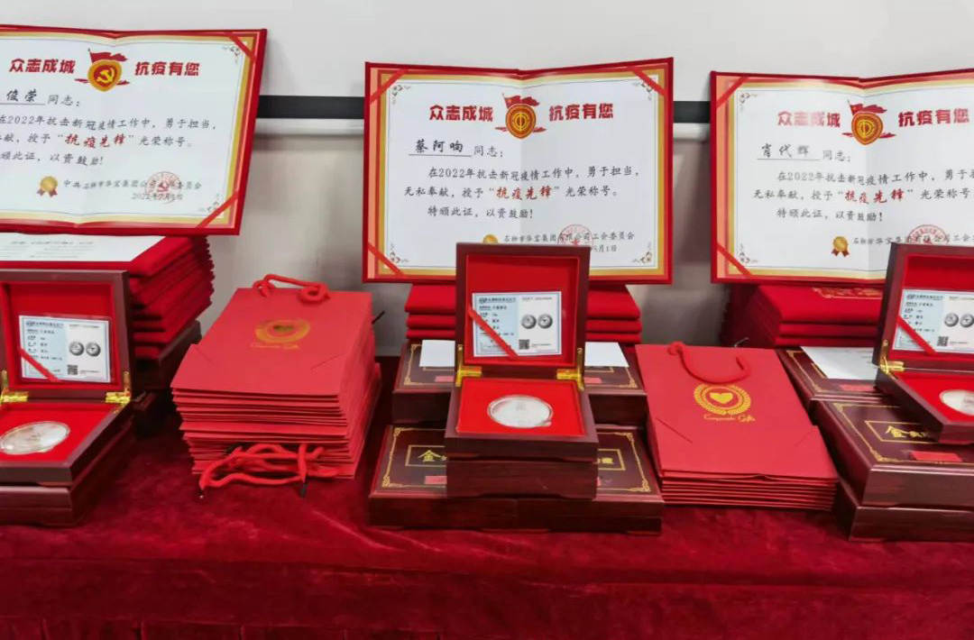 (上圖為獲得紀念章的黨員合集。“抗疫先鋒”紀念章由50g純銀打造,刻制專屬姓名和單位)