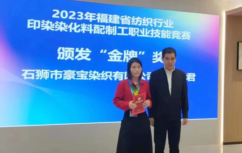 周麗君自2017年5月入職豪寶染織,現(xiàn)任配色副科長,工作矜矜業(yè)業(yè)、任勞任怨、業(yè)務精湛。這次經(jīng)華寶集團工會推選,周麗君作為石獅市印染企業(yè)染化料配制工8名代表之一,參加2023年福建省紡織行業(yè)印染染化料配制工職業(yè)技能競賽,并取得優(yōu)異成績,可喜可賀、振奮人心。希望華寶集團的所有員工向周麗君學習,愛崗敬業(yè),勤勞奉獻,不斷精進業(yè)務能力,提高職業(yè)技能水平。